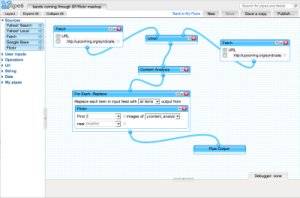 Jeremy nails the big picture as usual, so I’ll just point to a mashup that I built. The most exciting thing is that I didn’t really have to know how any of the APIs worked that I used — they are rolled into the product and all I have to do is feed data into the mix from my choice of RSS feeds, set up the pipeline with various parameters, and the data I want transforms and flows out of the other end like magic.
