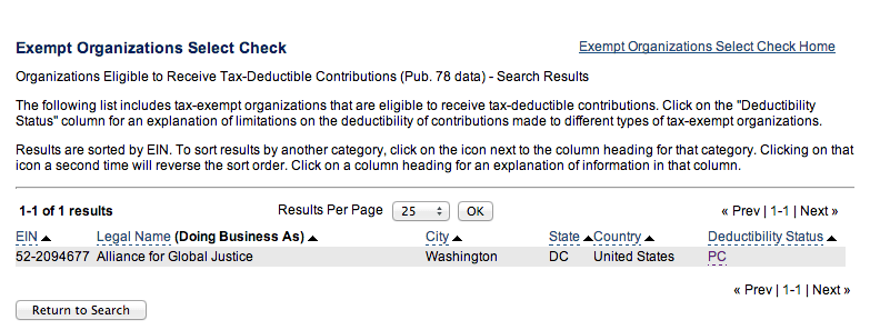 If you’re unsure about the organization behind Occupy Sandy, I checked into the Alliance for Global Justice, their fiscal sponsor, on the IRS.gov site. Publication 526 about Charitable Contributions (PDF) on page 2 points to a tool called Exempt Organizations Select Check. A search shows that the Alliance for Global Justice qualifies — here is a screenshot (PC stands for “public charity”):