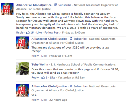 A representative from the Alliance for Global Justice has been answering the same questions on the Occupy Sandy Facebook page: